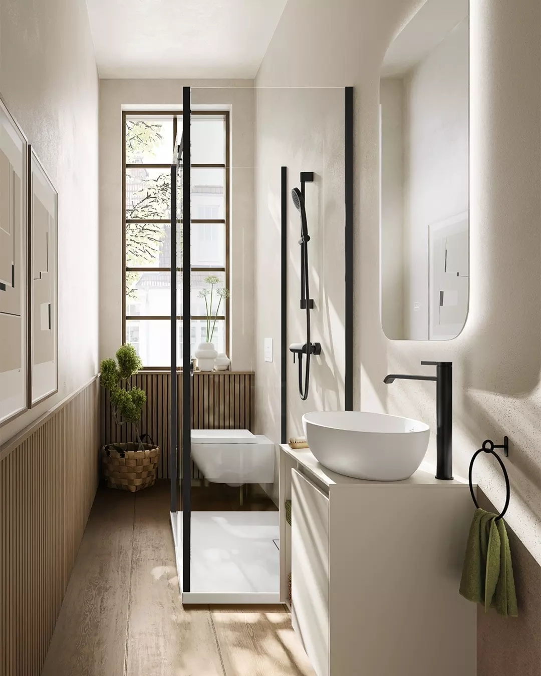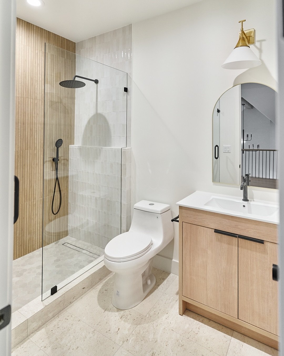 Clean, light, and just a little bit warm. The mix of vertical wood texture in the shower and soft tile keeps things interesting without overwhelming the eye. And that arched mirror moment? Subtle, but it makes a difference.