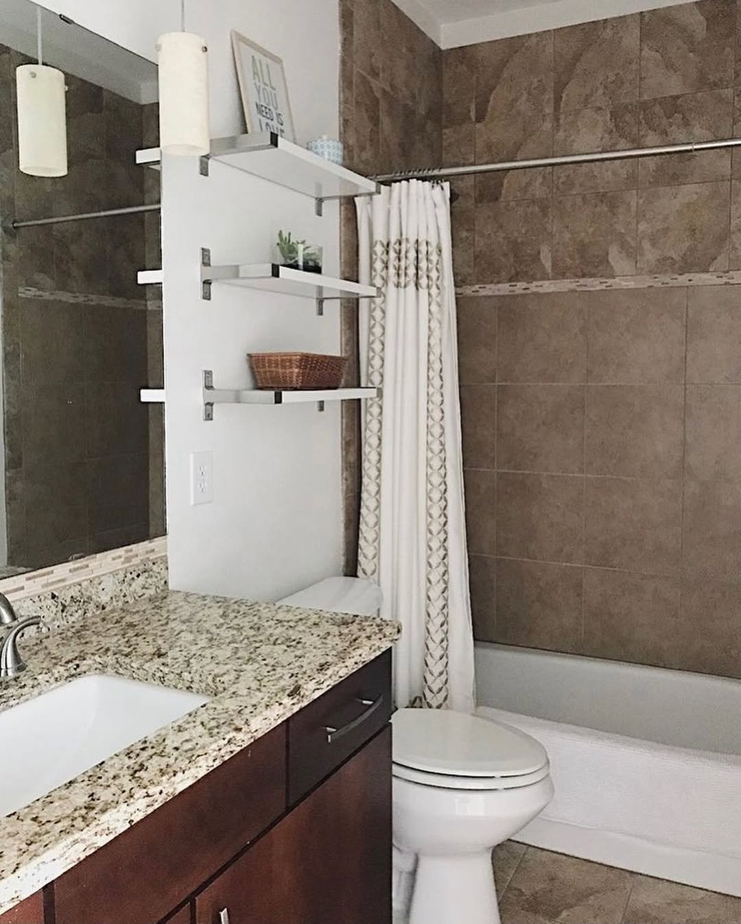 This is one of those “real life, but better” guest bathrooms. The neutral tile, simple vanity, and added shelving make it feel functional first—but not boring. Those floating shelves above the toilet? Low effort, high impact.