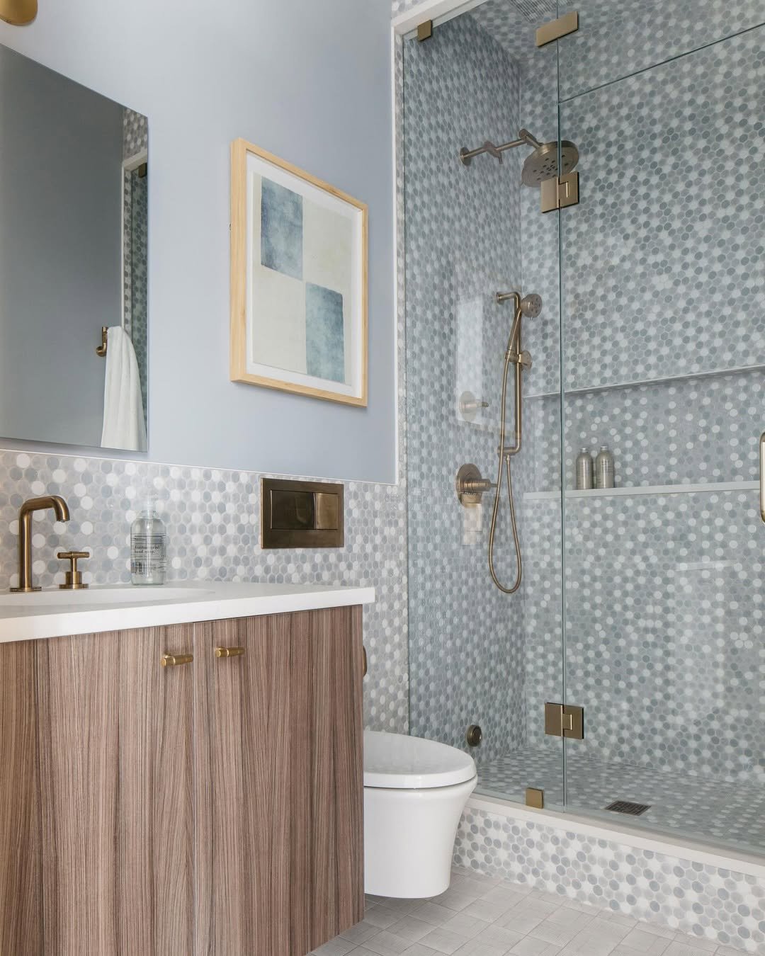 Light, airy, and a little bit playful. That soft blue tile brings a refreshing vibe, while the wood vanity keeps it grounded. It’s a gentle mix of cool and warm that just works.