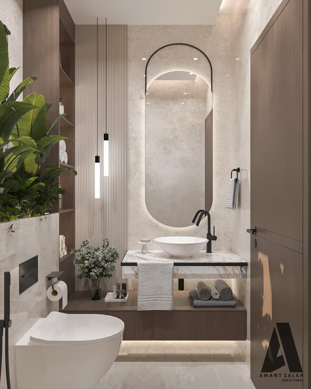 There’s something almost spa-like about this one. The curved mirror, soft lighting, and neutral palette all come together in a way that feels calm without being boring. It’s minimal, but there’s still texture everywhere—walls, cabinetry, even the lighting.