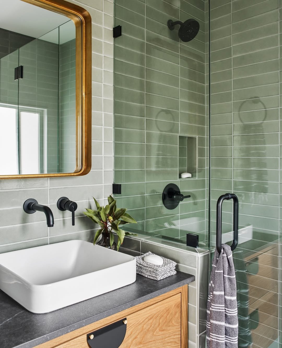 This one feels grounded—literally. Those green tiles paired with matte black fixtures create a calm, earthy palette that’s super easy on the eyes. And the natural wood vanity keeps it from feeling too cool or clinical.