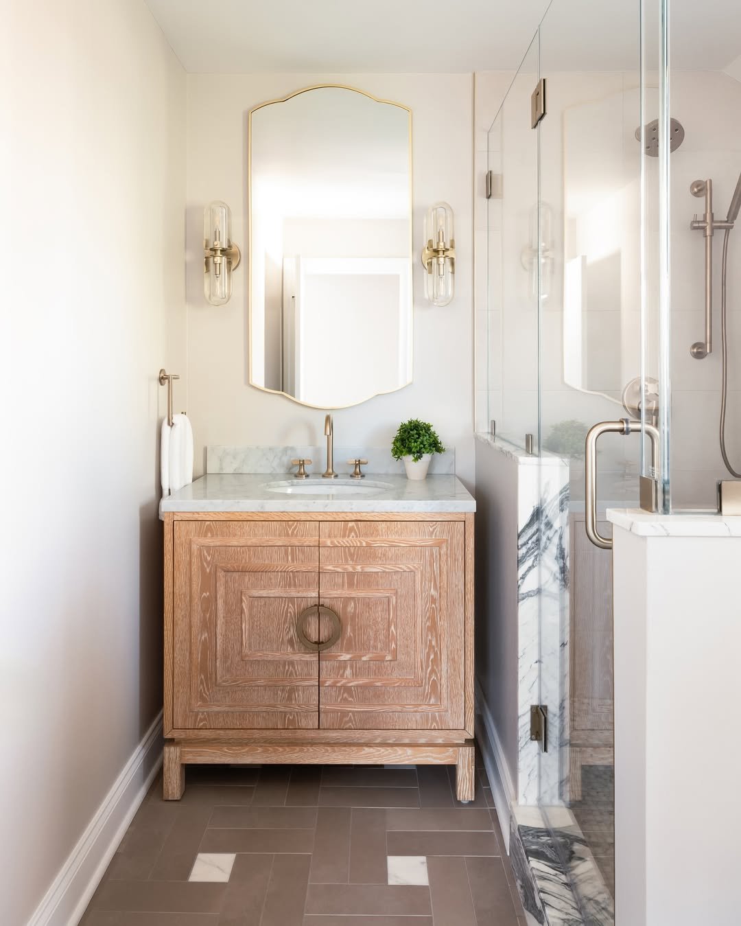 Okay, this one has presence. That bold marble shower instantly grabs attention, while the vintage-inspired vanity and brass details bring in warmth and character. It’s dramatic—but grounded.