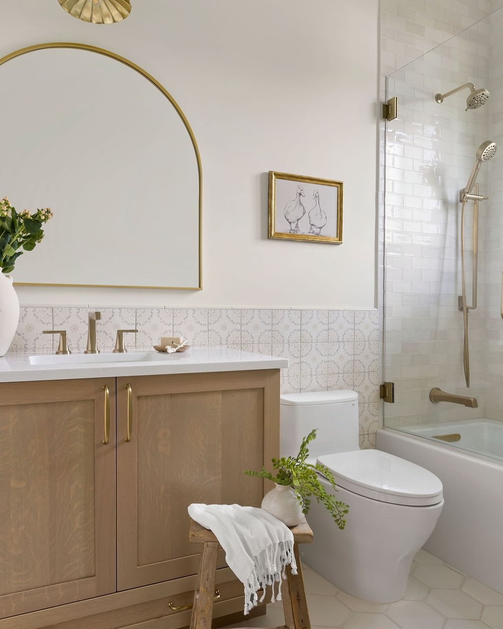 This space feels layered in the best way. From the art to the patterned sink to those warm brass fixtures, everything has a bit of personality. It’s not matchy—and that’s exactly why it works.