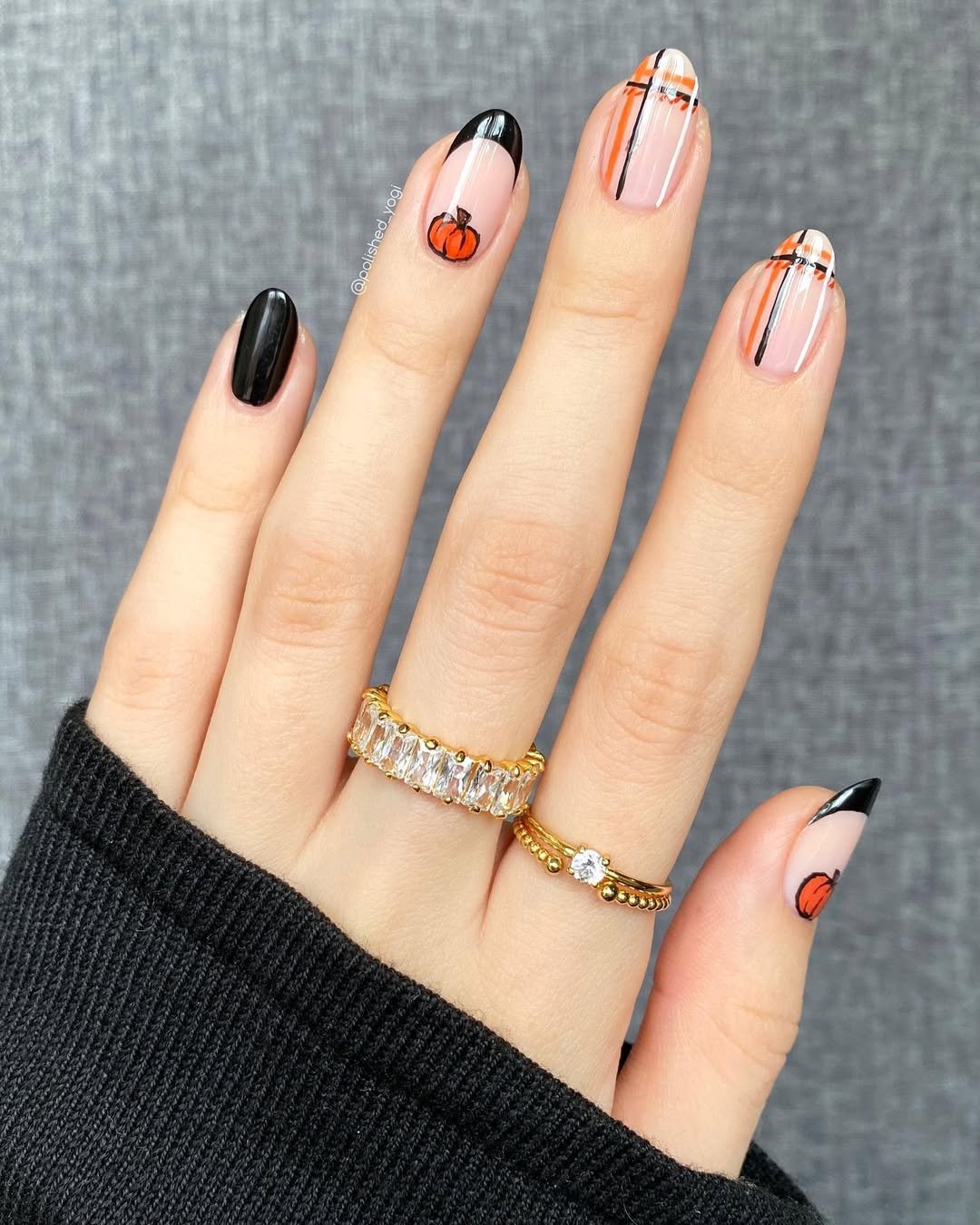 This set is proof that Halloween nails don’t need to be loud to make a statement. They’re cozy-cardigan-meets-black-cat energy, and honestly, they’d be right at home wrapped around a chai latte on a brisk morning. Bonus points for that subtle glam ring stack that ties it all together.