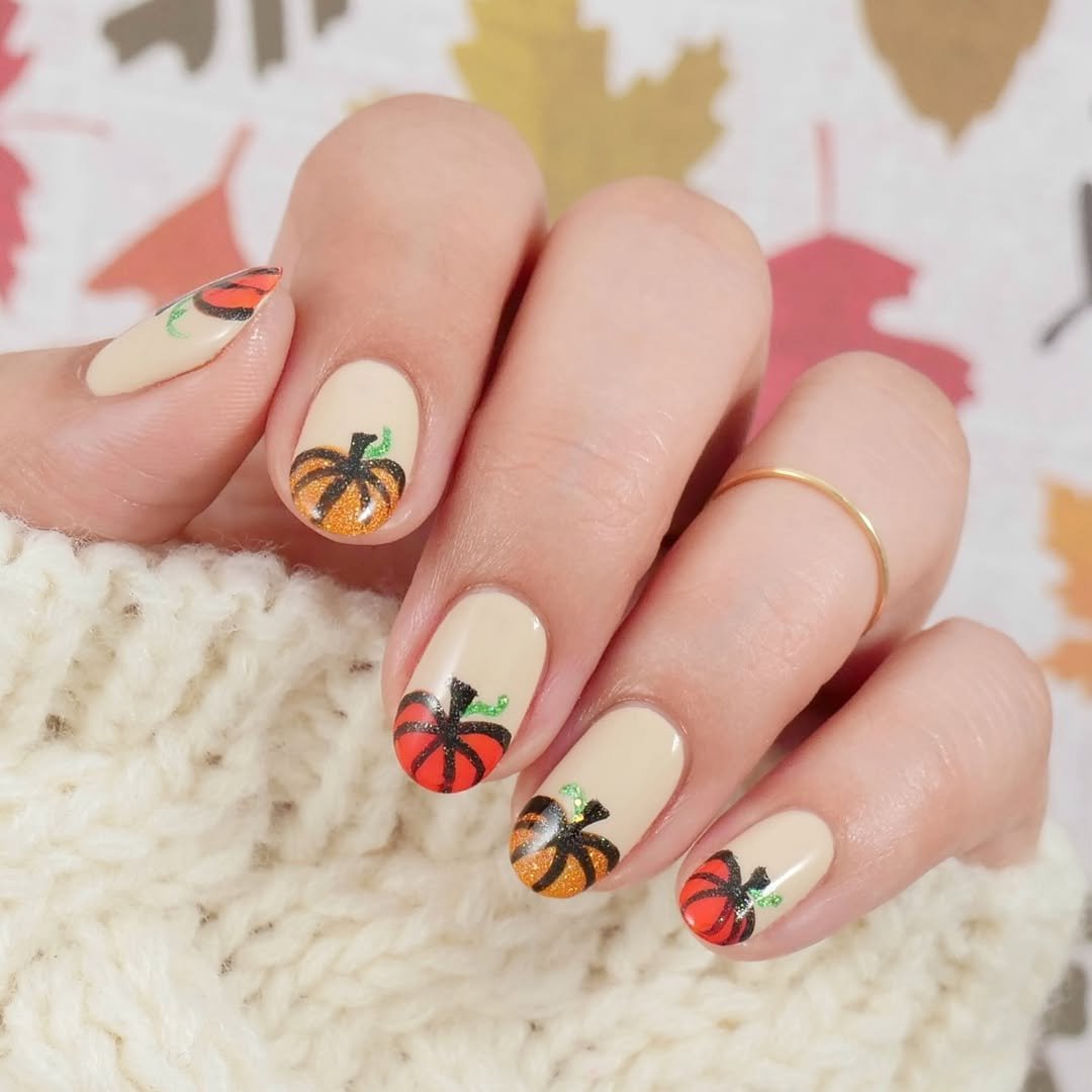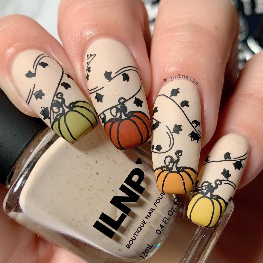 This one’s for the design lovers. Soft ivory polish becomes a canvas for delicate pumpkin sketches in earthy tones—mustard yellow, moss green, and burnt sienna. The swirling vines and leaves bring the whole set to life with understated whimsy.