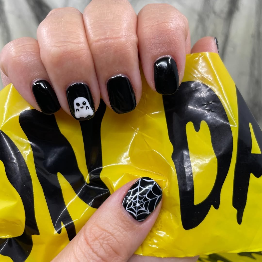 Here’s proof that short nails can still slay Halloween. A high-gloss black base anchors the look, while the single ghost and spiderweb accents pop with playful contrast.