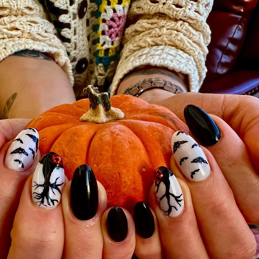 @westportnailfactory went for eerie-meets-elegant with this black-and-white forest scene. Between the silhouetted trees, flying bats, and glossy obsidian ovals, it’s giving haunted woods at midnight. The red detail on the middle finger (hello, spooky ladybug?) is just the kind of offbeat touch we live for.