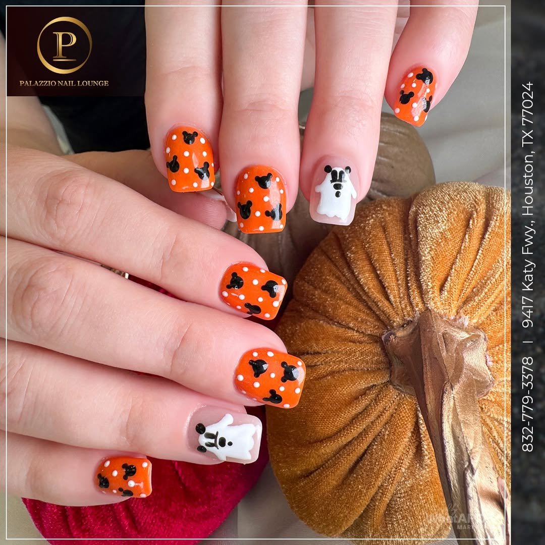 A little Disney, a little trick-or-treat. This orange and white combo is bubbly and bright, with sweet ghost characters and scattered Mickey heads that feel right at home in a Halloween theme park.