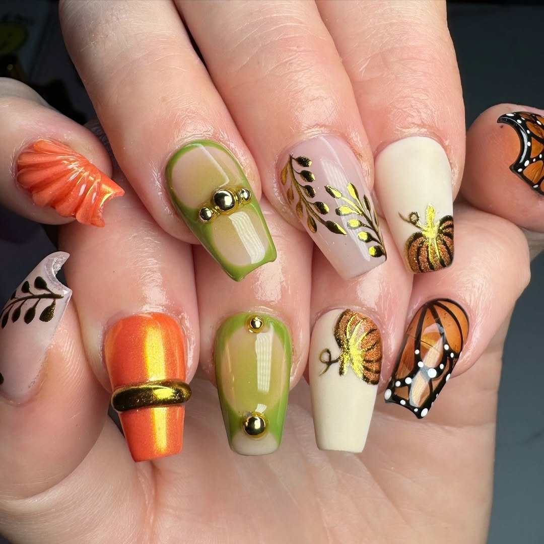 This is autumn elegance turned up to eleven. From metallic pumpkins and butterflies to leafy gold decals and 3D charms, every nail here feels like a tiny art piece. The palette? An elevated mix of rust orange, mossy green, and creamy neutrals.