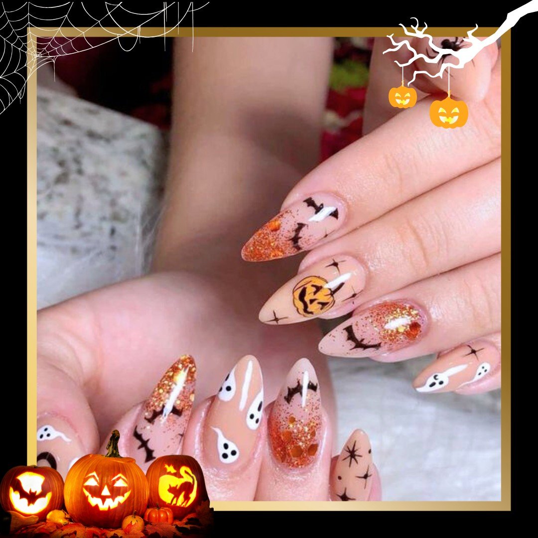 If Halloween is your Super Bowl, this is your look. These almond nails go full spooky-season with floating ghosts, jack-o’-lanterns, bats, and sparkle—without ever feeling costume-y. It’s a glam horror movie on your fingertips, where every nail tells a different story. The orange glitter is the cherry on top, adding just enough glam to make it feel party-ready.