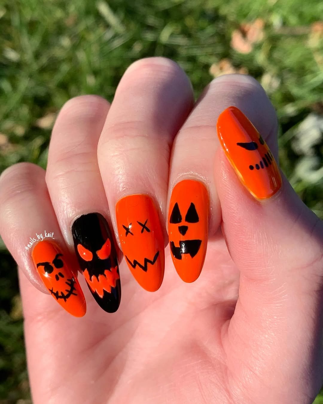 These fiery little faces are here to haunt—but in the chicest way. High-shine orange and black polish gets carved into sinister jack-o’-lantern smirks, glowing eyes, and stitched-up grins that look straight out of a Tim Burton dream.