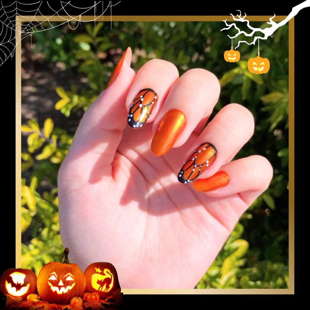 This set is such a fresh take on Halloween orange. Instead of pumpkins, you get butterfly wings—painted in glowing, iridescent orange that mimics fall leaves mid-flight. It’s nature-inspired and absolutely dreamy. If you’re into seasonal colors but don’t want literal pumpkins on your nails, this design flutters in with a gorgeous compromise.