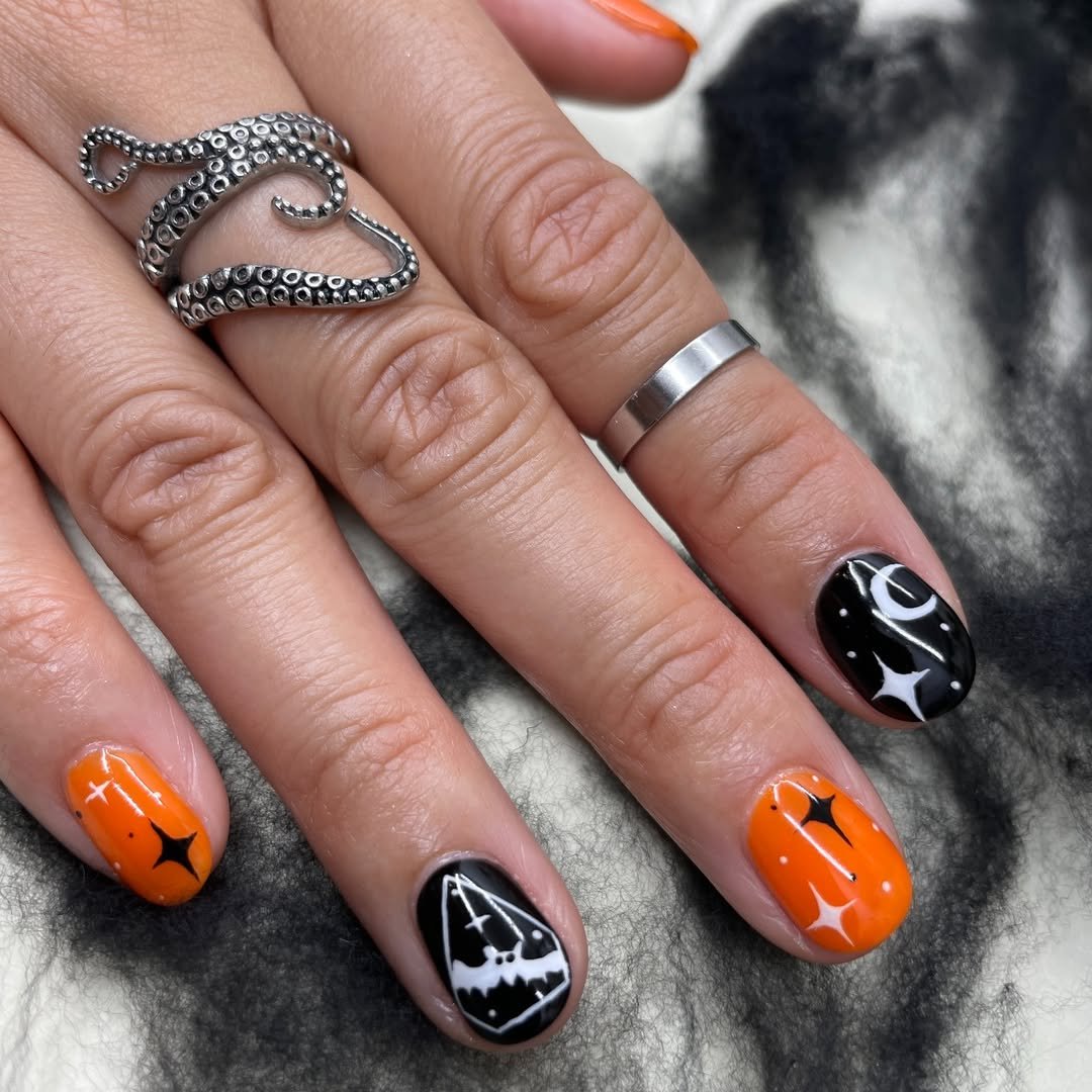 Crisp, graphic, and straight-up spellbinding. These shorties get a dose of cosmic cool with black and orange polish split between starbursts, moons, and witchy silhouettes. The sharp white detailing brings the whole thing to life like ink on parchment.