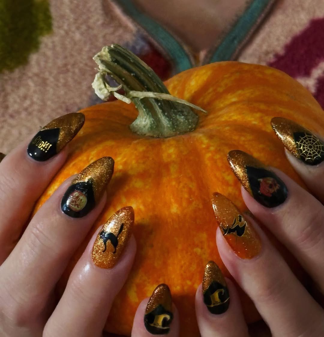 There’s glam Halloween, and then there’s this—witchy decadence wrapped in a golden haze. The mix of black, amber glitter, and moody motifs like spiderwebs, skulls, and haunted house silhouettes creates a set that’s dramatic and cinematic. These nails don’t whisper “October,” they howl it under a harvest moon.