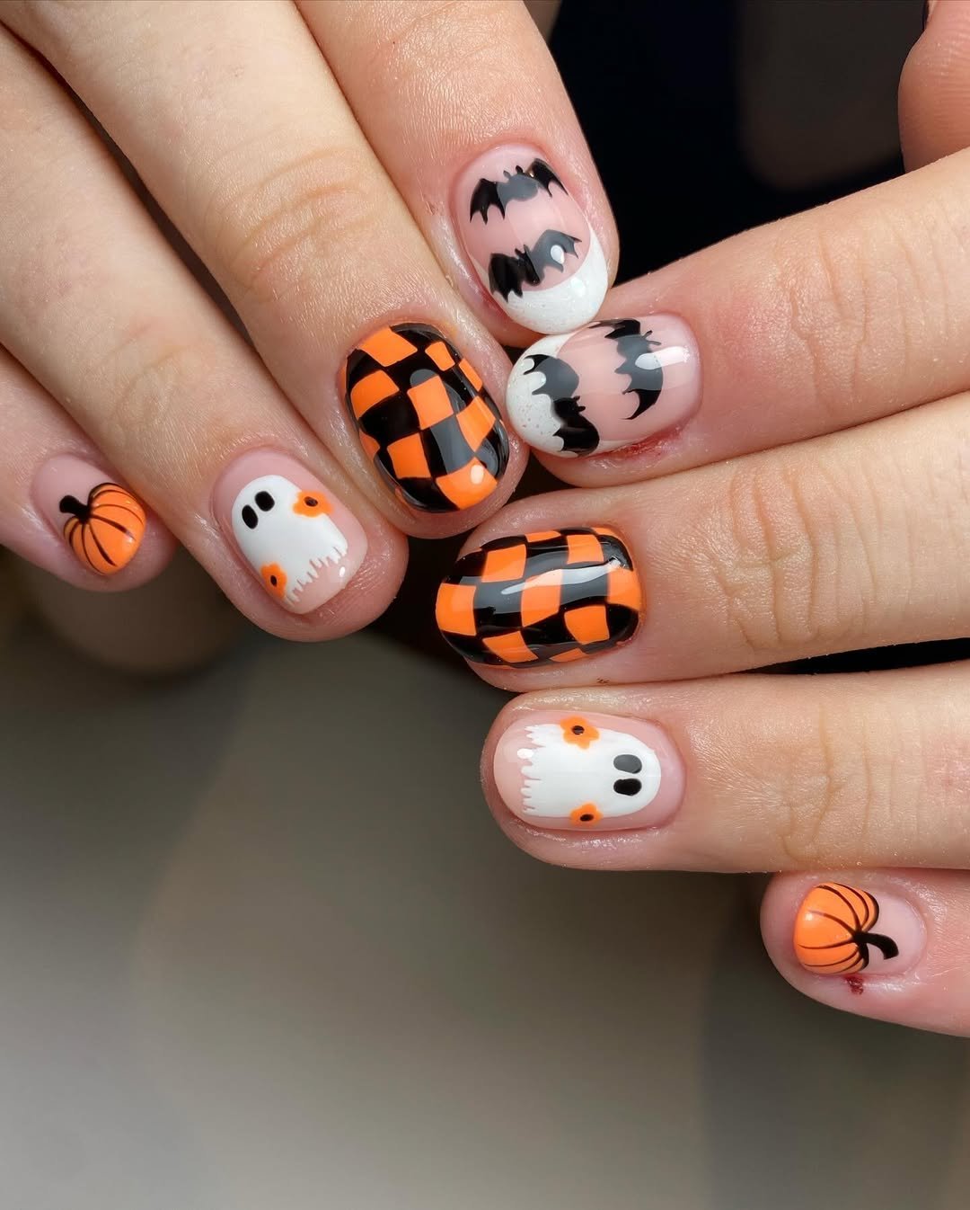 There’s something gleefully nostalgic about this playful mash-up from @theblacklistedbeauty. Ghosts, bats, pumpkins, checkerboard—this is your favorite childhood Halloween party, but make it manicure. The bold color blocking is graphic and fun, and somehow all these busy elements come together in a perfectly spunky harmony.