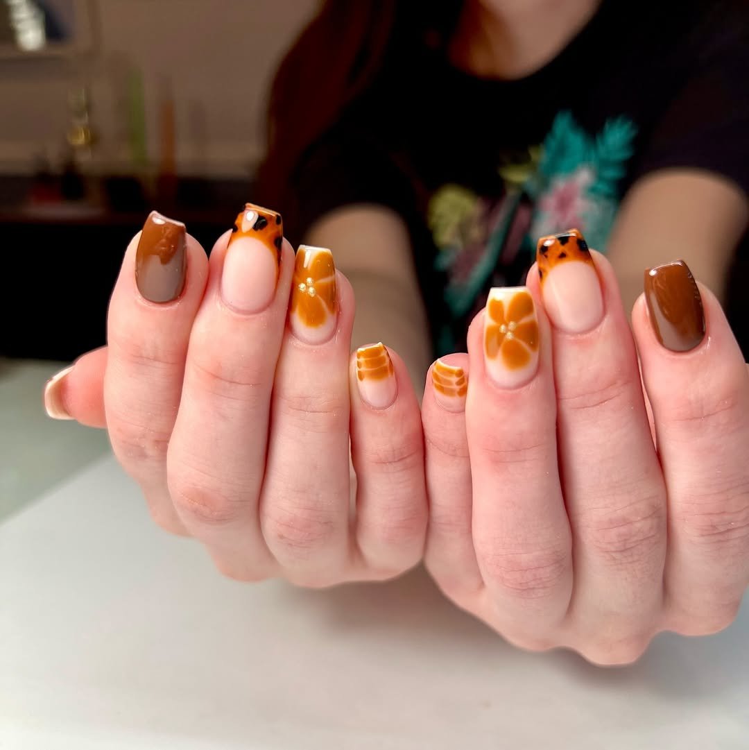 Warm caramel tones, tortoiseshell accents, and a groovy floral twist—this set screams fall without screaming “pumpkin patch.” The mix of earthy shades paired with bold patterns makes it cozy but still modern. Honestly, it feels like your nails just put on a retro fall sweater.