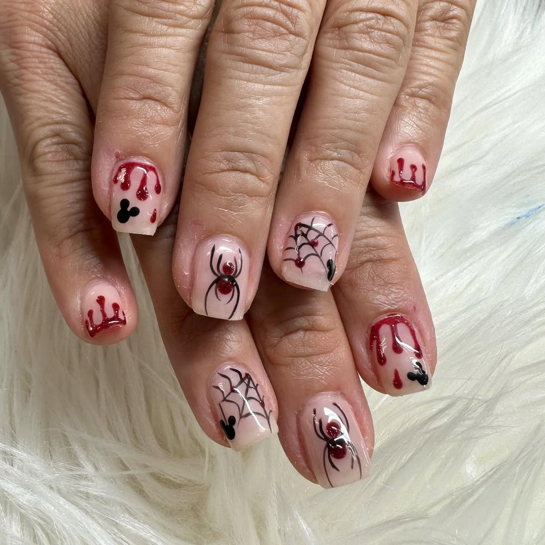 Now this one leans into the creepy-crawly side of October. Red drip accents, spiders, and webs all crawling across a nude base—this set is not afraid to embrace the spooky.