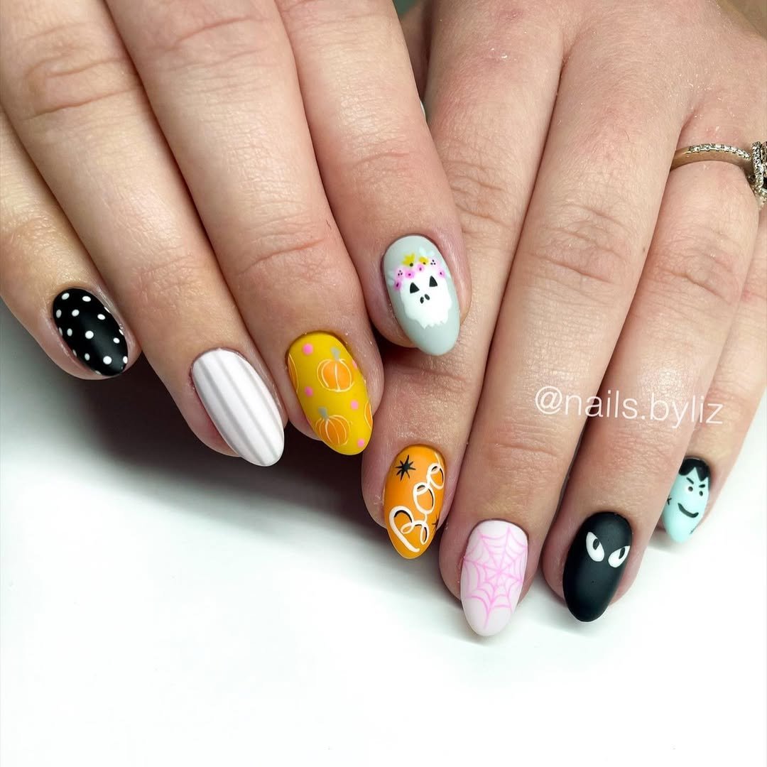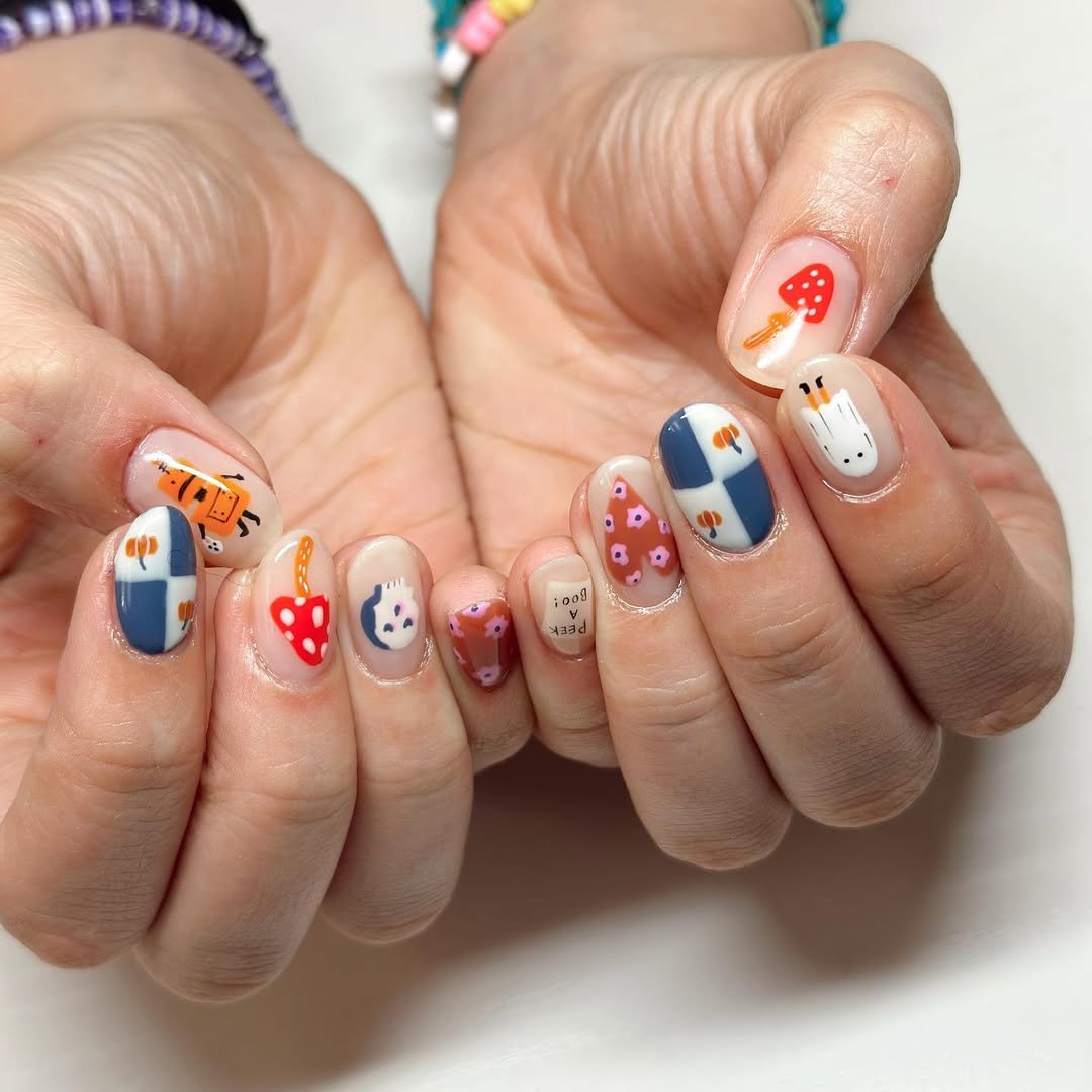 This one is like flipping through a Halloween picture book. Mushrooms, ghosts, florals, checkerboard, and even tiny handwritten text—it’s storytelling on nails. Each finger feels like a page in its own little tale.