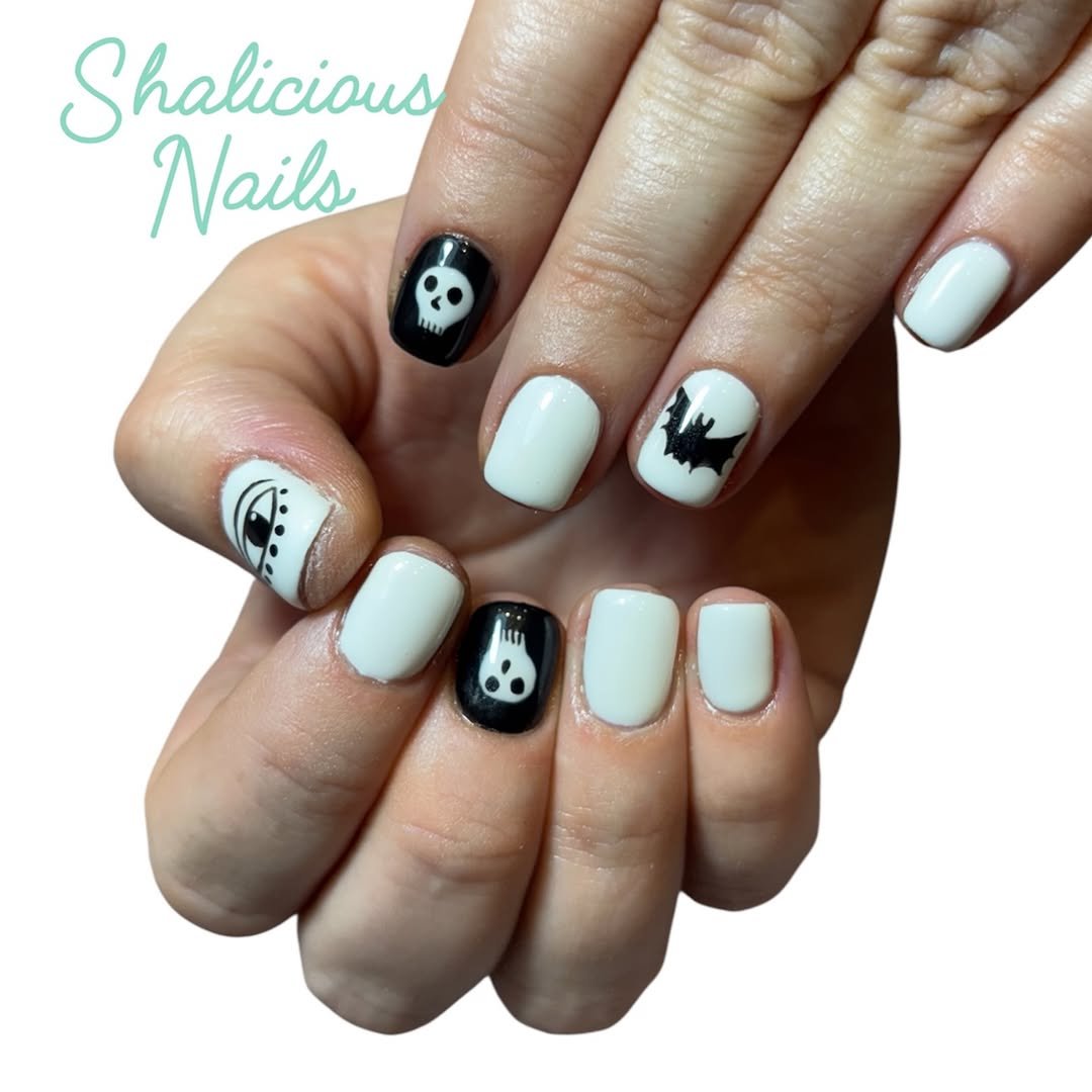 If you want spooky but luxe, this set has you covered. With haunted house silhouettes, skulls, webs, and ghosts all in black-and-white detailing, these nails feel like gothic artwork.