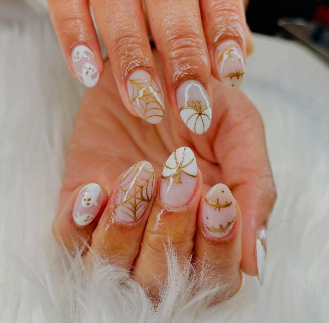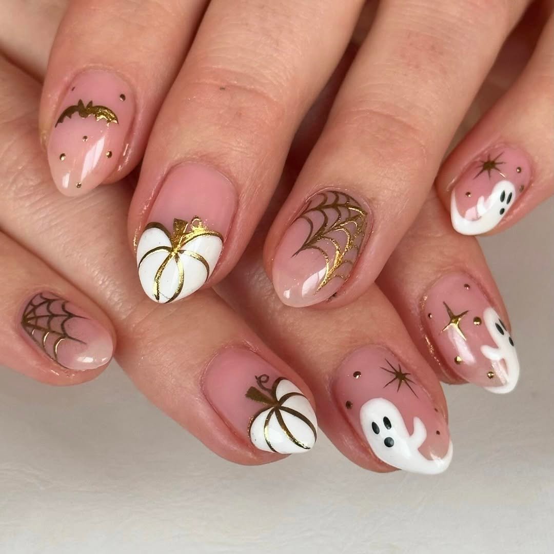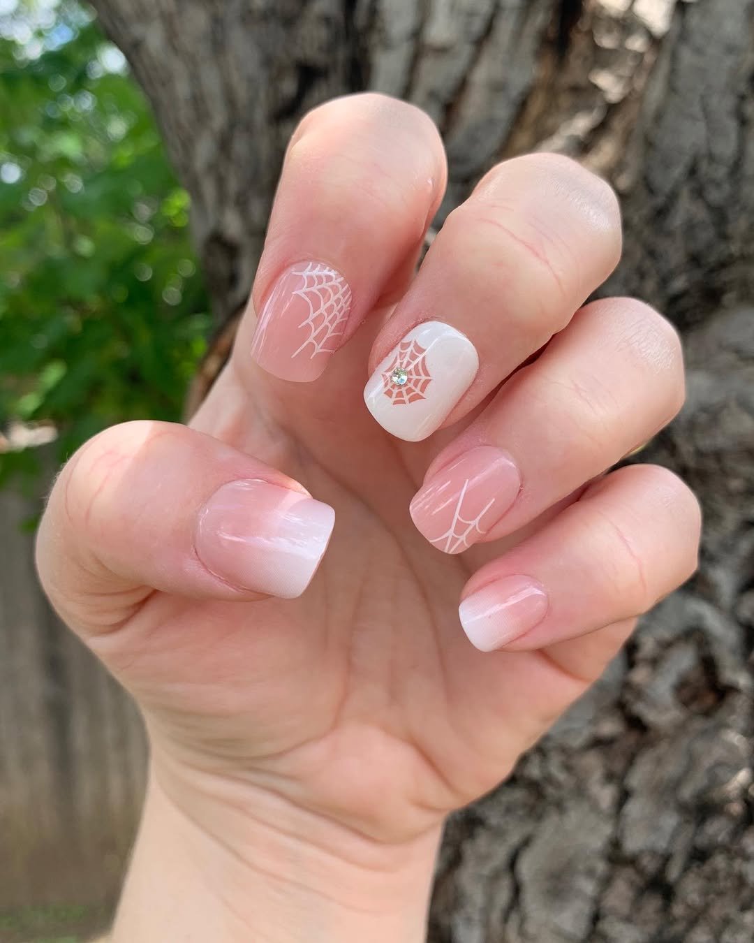 Delicate webs and spiders take center stage here, set against a muted nude-pink base. This one’s for the minimalist who still wants a nod to Halloween.