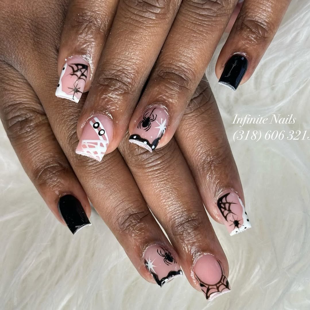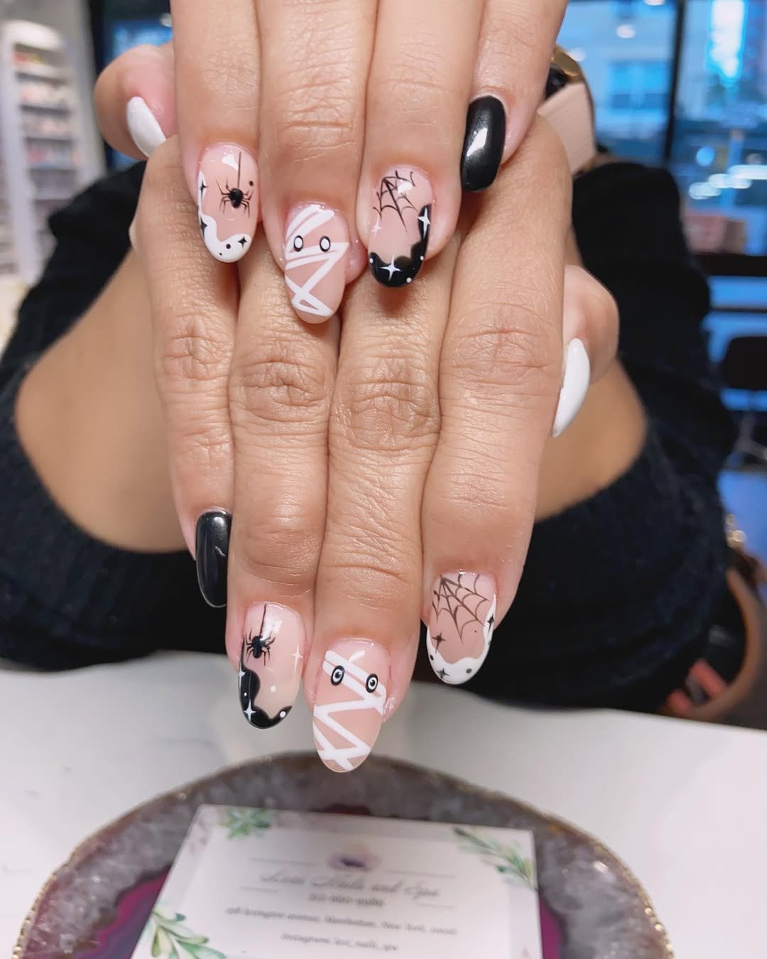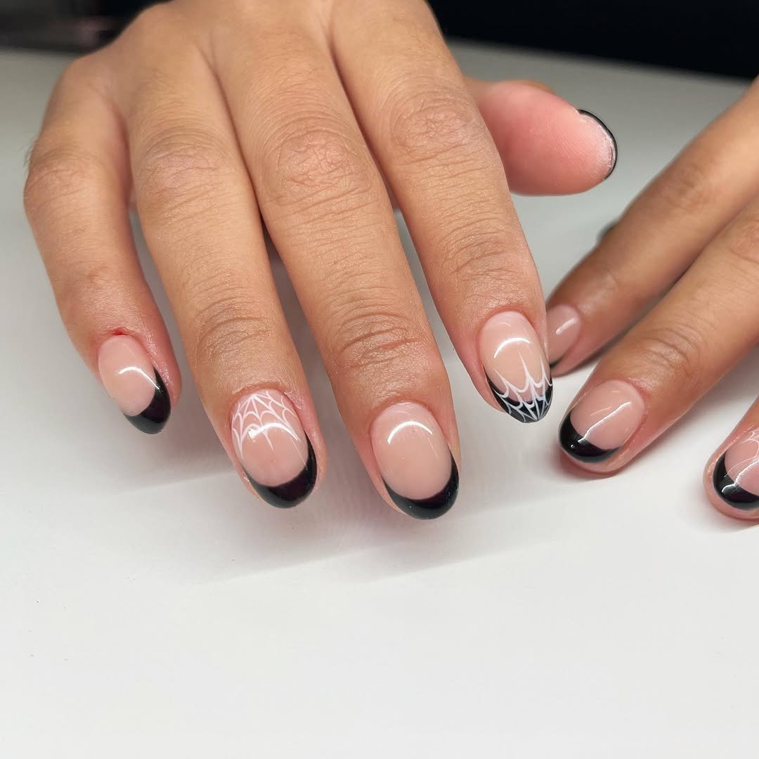 Delicate webs and spiders take center stage here, set against a muted nude-pink base. This one’s for the minimalist who still wants a nod to Halloween.