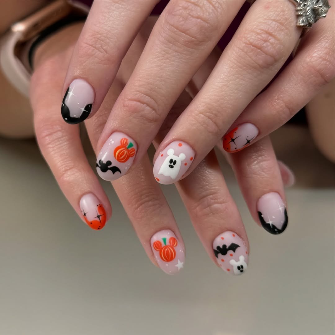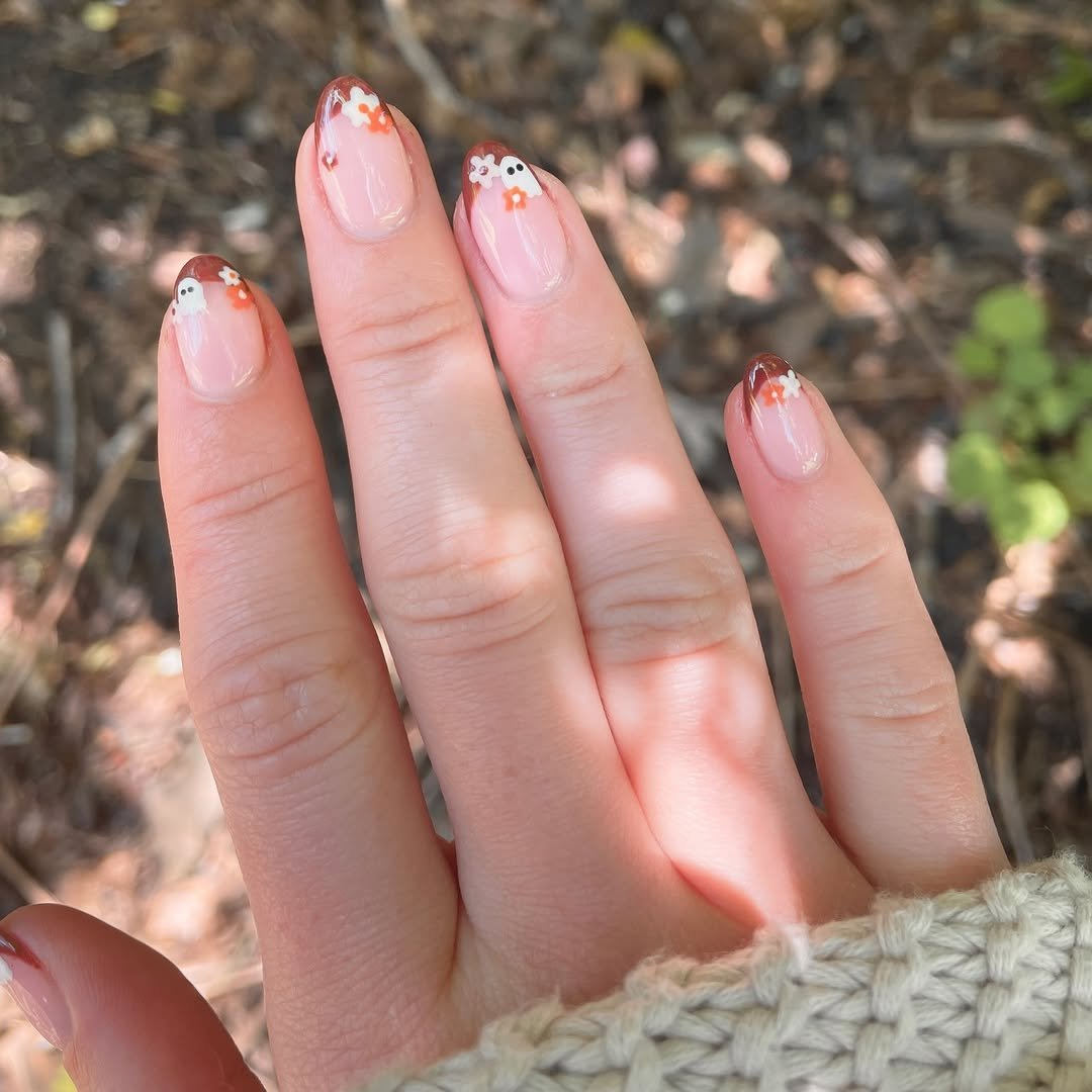 Sometimes it’s the tiniest details that make the biggest statement. These short, sweet nails keep things light with little floating ghosts and stars, all on a neutral pink base. It’s playful but not overwhelming.