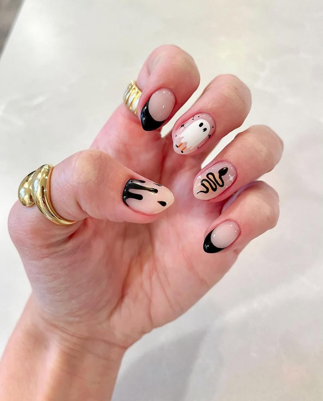 Edgy and artsy all at once—this set takes Halloween classics and gives them a bold twist. With drips, ghosts, snakes, and chic black French tips, it’s serving major cool-girl energy.