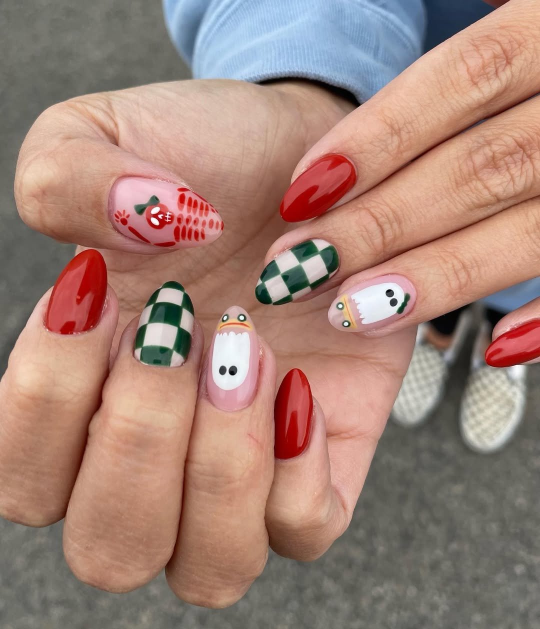 This set flips the script by adding unexpected colors like green and red into the Halloween mix. Checkerboards, bold red nails, and little ghost faces—it’s like a mash-up of cozy fall and spooky vibes.