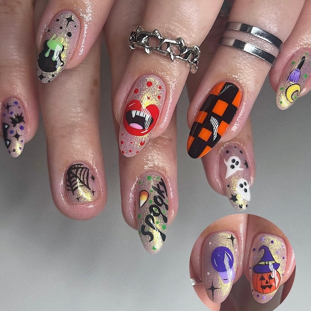 These nails take Halloween to a whole new level of sparkle. You’ve got everything—dripping goo, vampire lips, ghosts, pumpkins—all layered over a glittery base that makes the whole design pop. It’s like a horror comic book got dusted with fairy dust.