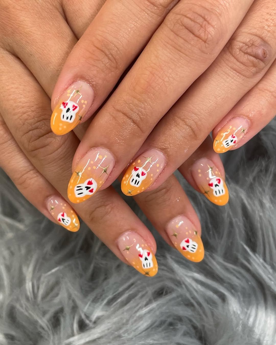This set is playful and a little cheeky—bright orange tips paired with cute skulls decorated with red heart eyes. It’s Halloween, but make it flirty. The tiny gold stars sprinkled across give it that extra sparkle, like confetti for your fingertips.