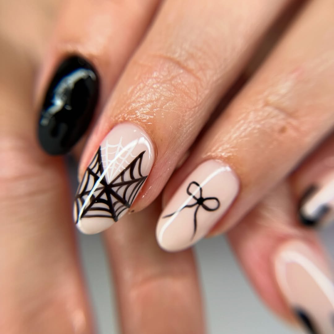 Now this one is drama with a capital D. Black nails paired with spider webs and a delicate bow—like a gothic romance novel in nail form. It’s sharp, stylish, and definitely gives that witchy vibe without a single pumpkin in sight.