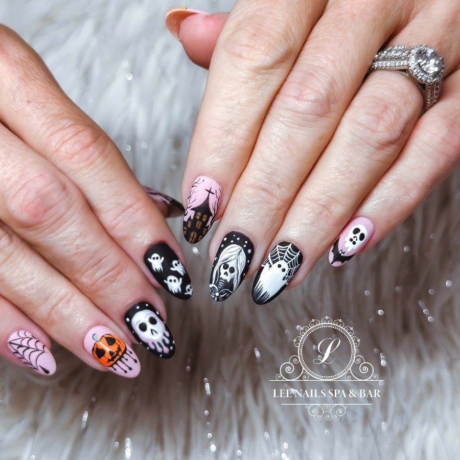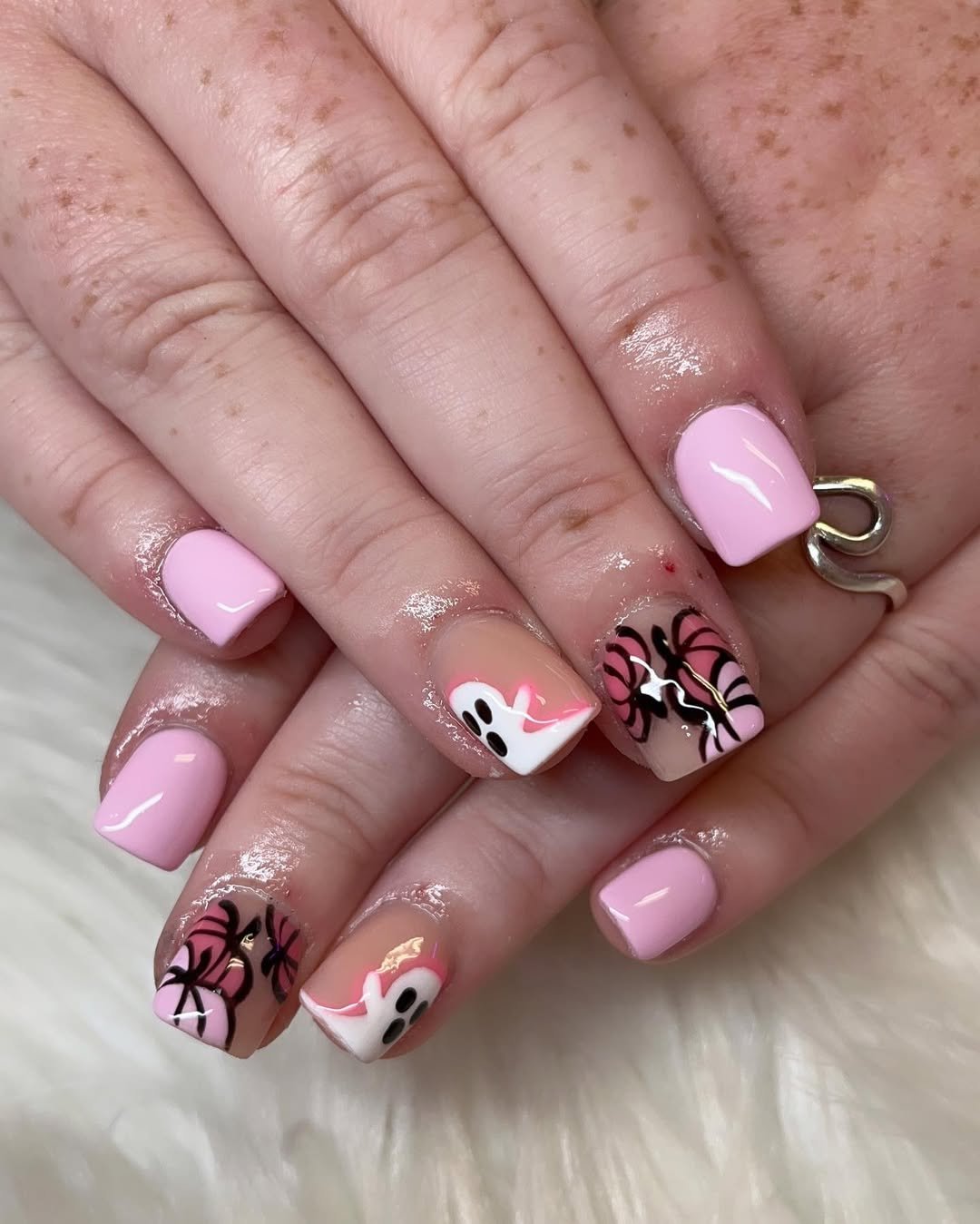 This set proves pink has a place in Halloween too. Instead of going dark and moody, these nails bring in a softer palette, pairing baby pink with ghosts and spider webs. The contrast is unexpected but works so well.