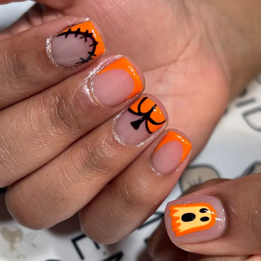 Bright orange French tips with stitched details, paired with a fiery ghost on the thumb—it’s a bold but minimal design. Each nail has its own moment, but the color palette ties it all together.