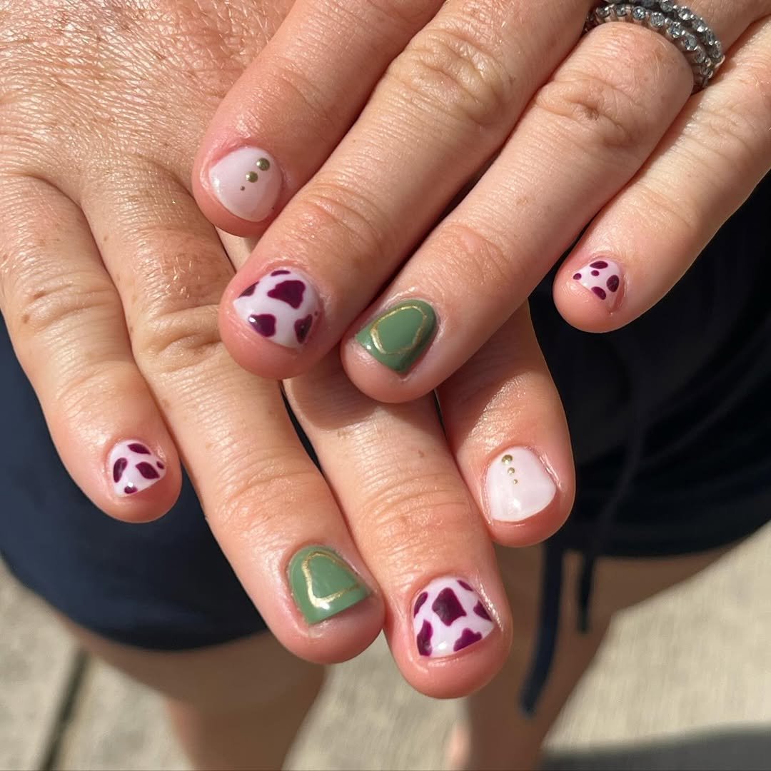 This one’s a little different—a moody, artsy spin with earthy greens, maroons, and abstract patches. Not traditionally Halloween, but it has that fall-season edge. It’s like the “quiet luxury” version of spooky nails, perfect if you want to nod to the season without cartoon ghosts.