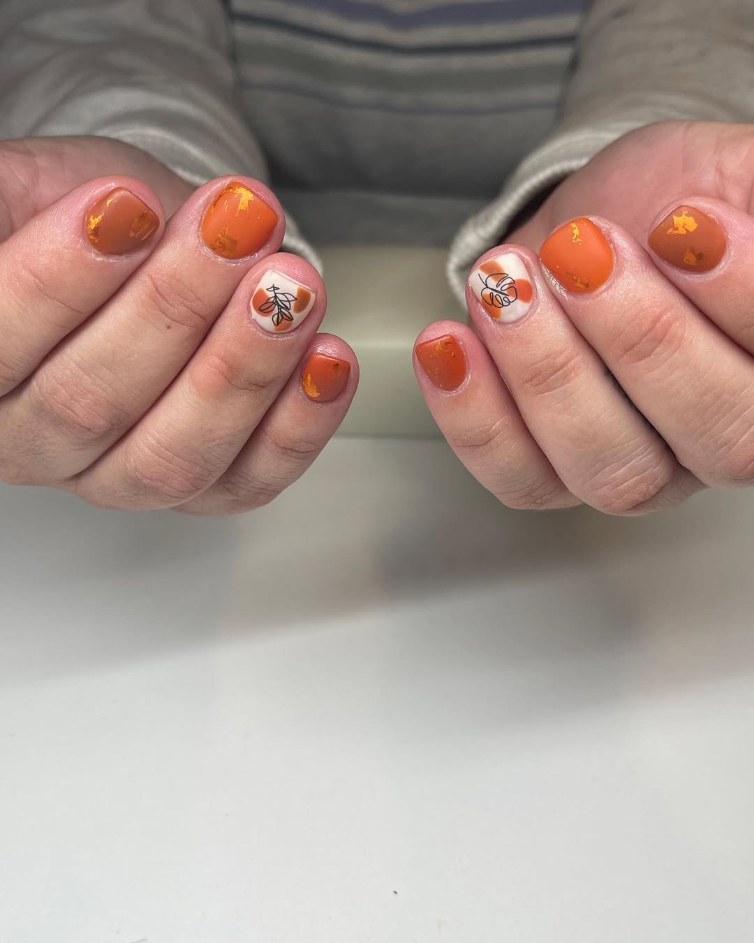 Short, cozy nails in burnt orange with little bee-like accents. This set feels more fall harvest than full-on spooky, but it works so well for Halloween if you’re going understated. The specks of foil add a little magic without being loud.
