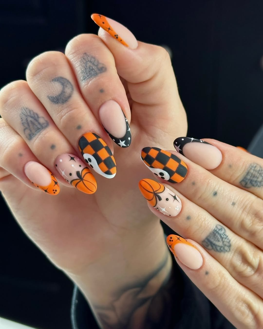 Stars, moons, ghosts, and pumpkins all dance across these nails, like a little Halloween night sky. The nude base makes it soft, while the pops of orange and black bring the drama. It’s whimsical but not childish—kind of like if Halloween had its own zodiac sign.
