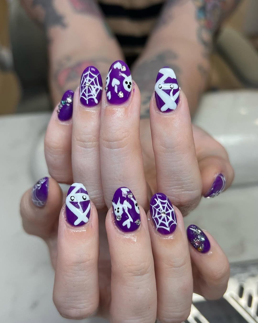 Bold purple with webs, mummies, bones, and rhinestone accents—this set is playful and a little edgy. It gives off “Halloween party at the coolest friend’s house” vibes. You know the one who has dry ice in their punch bowl? Yeah, these nails belong there.