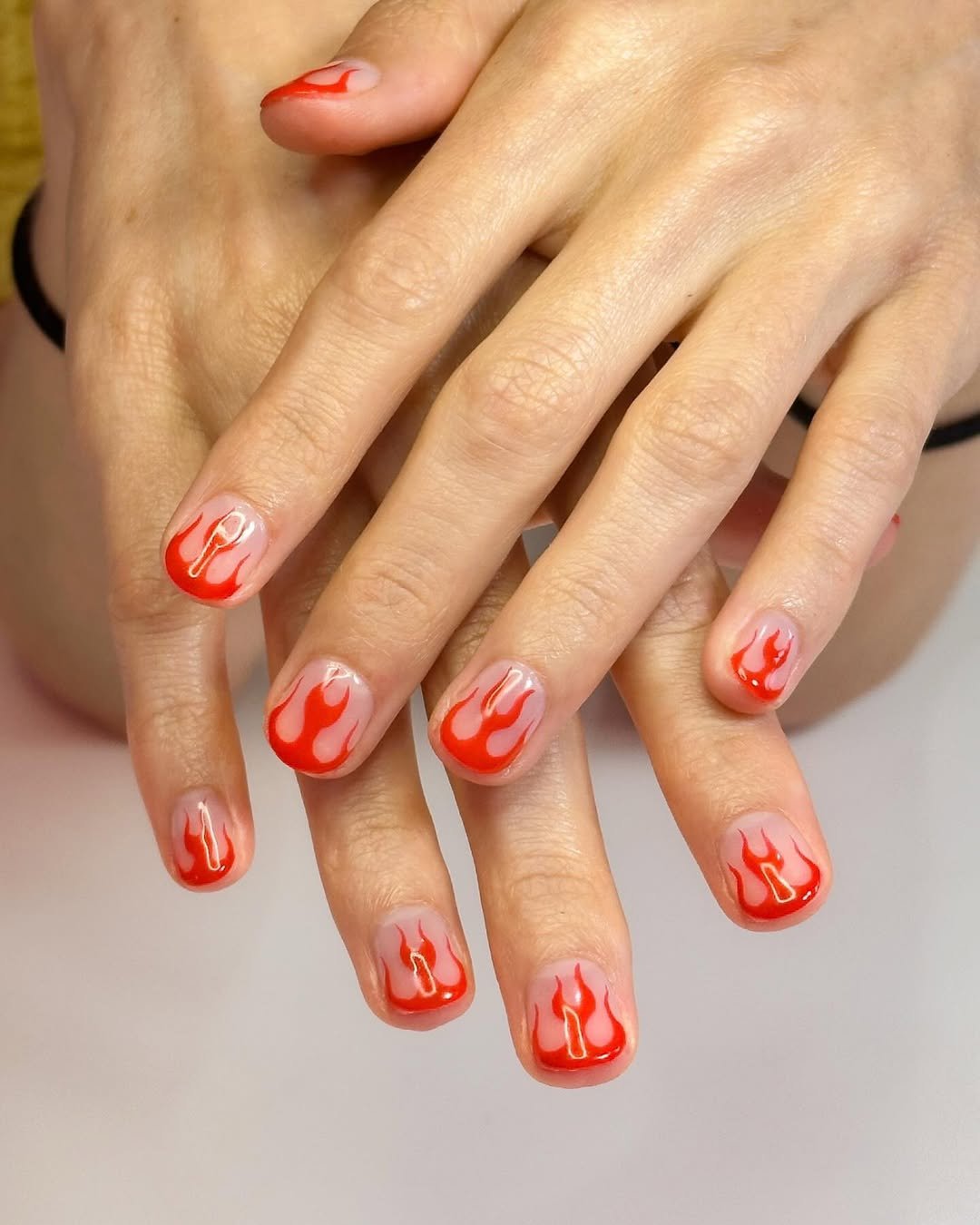 I love how the flames elongate the nails visually, even though the shape is kept short and square. It’s fierce but practical, which makes it the kind of set you could totally rock daily while still feeling like you’re in your cool-girl era.