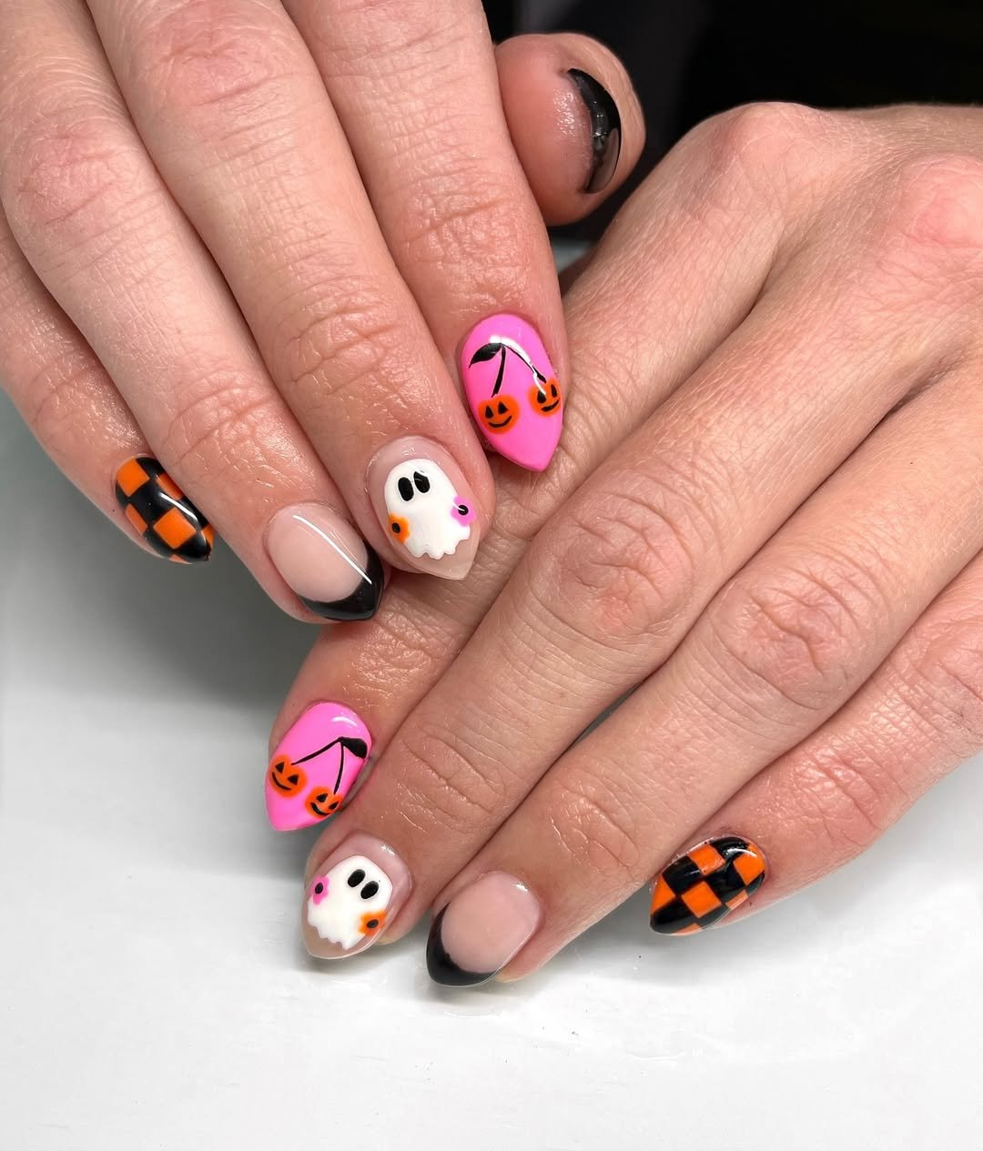 Hot pink, checkerboard, and little ghost cherries? This set is giving Halloween with a twist. Instead of leaning all the way into black and orange, it plays with playful pops of color that make the classic spooky motifs feel fresh. The mix of French tips, graphic ghosts, and cheeky pumpkin cherries is such a fun balance.