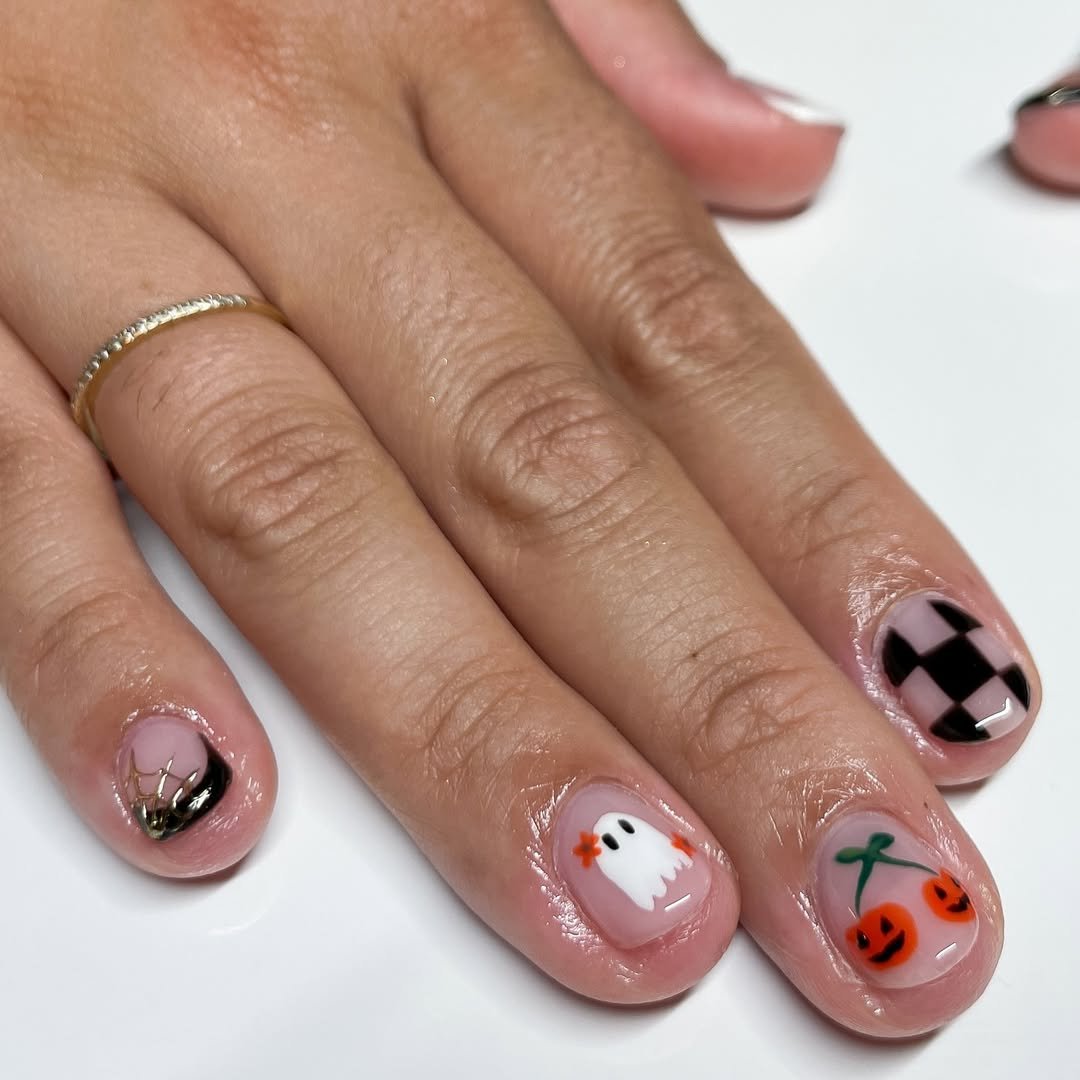 Ghosts, pumpkins, checkerboard patterns—this mani packs a punch despite being short and sweet. The tiny, hand-painted details are adorable and super wearable, especially if you prefer natural-length nails.