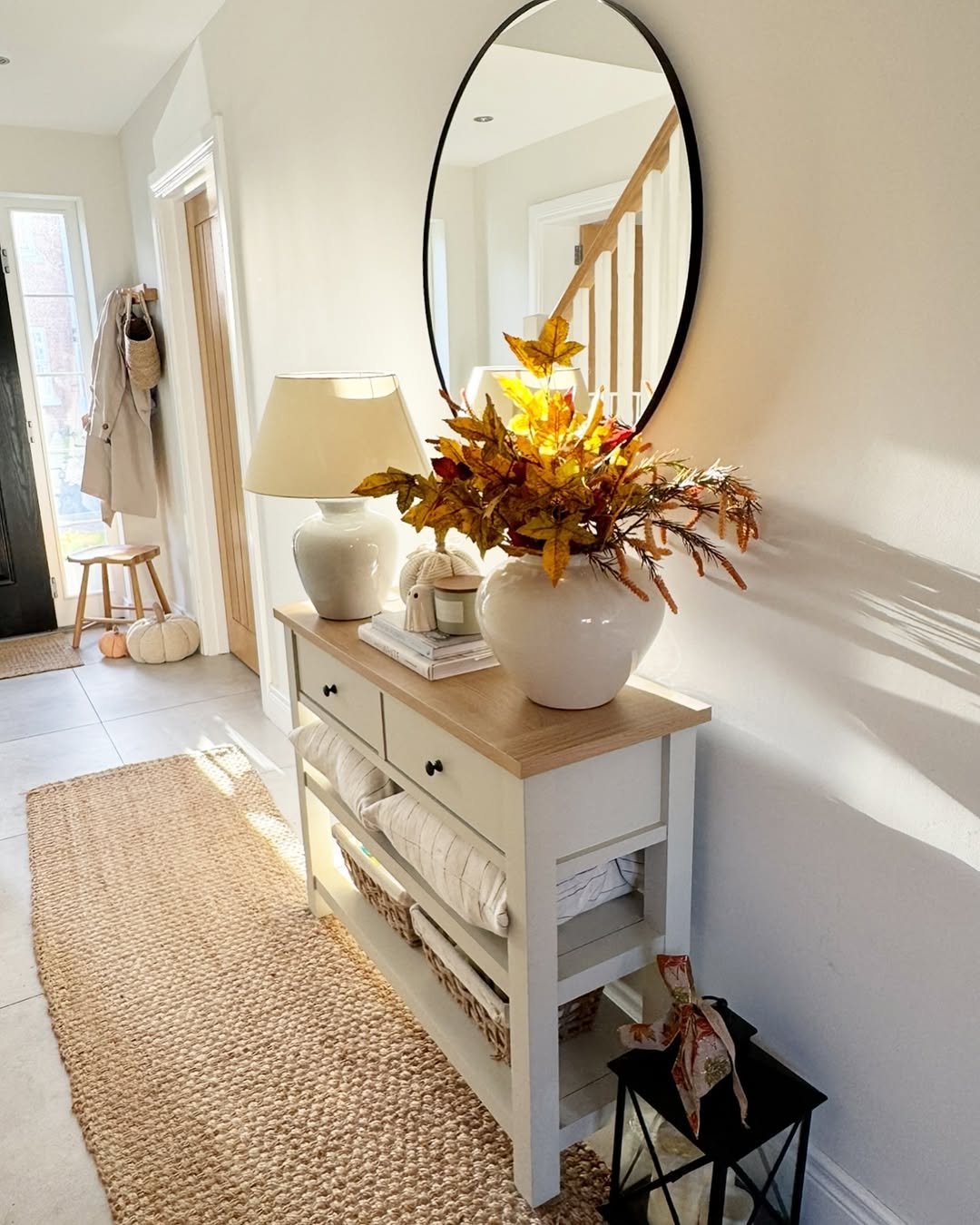 This hallway leans into the season in the most inviting way. Warm light, soft neutrals, and that arrangement of amber leaves create a quiet moment that feels like late afternoon sunlight.