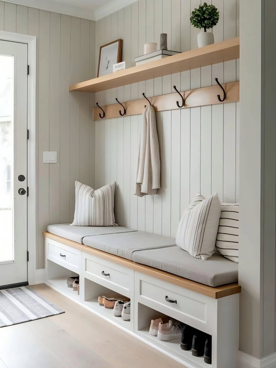 What makes it work is the balance between clean lines and comfort. Cushions, hooks, and that simple shelf styling turn it into more than storage. It feels like a place you actually pause before heading out.