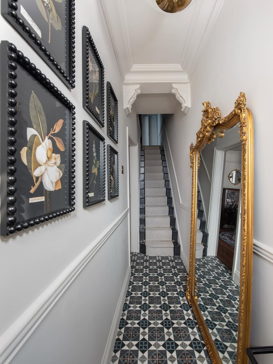 The floor does most of the talking here, and it does it beautifully. Those geometric tiles set against soft walls and classic paneling create a hallway that feels fresh but rooted in tradition.