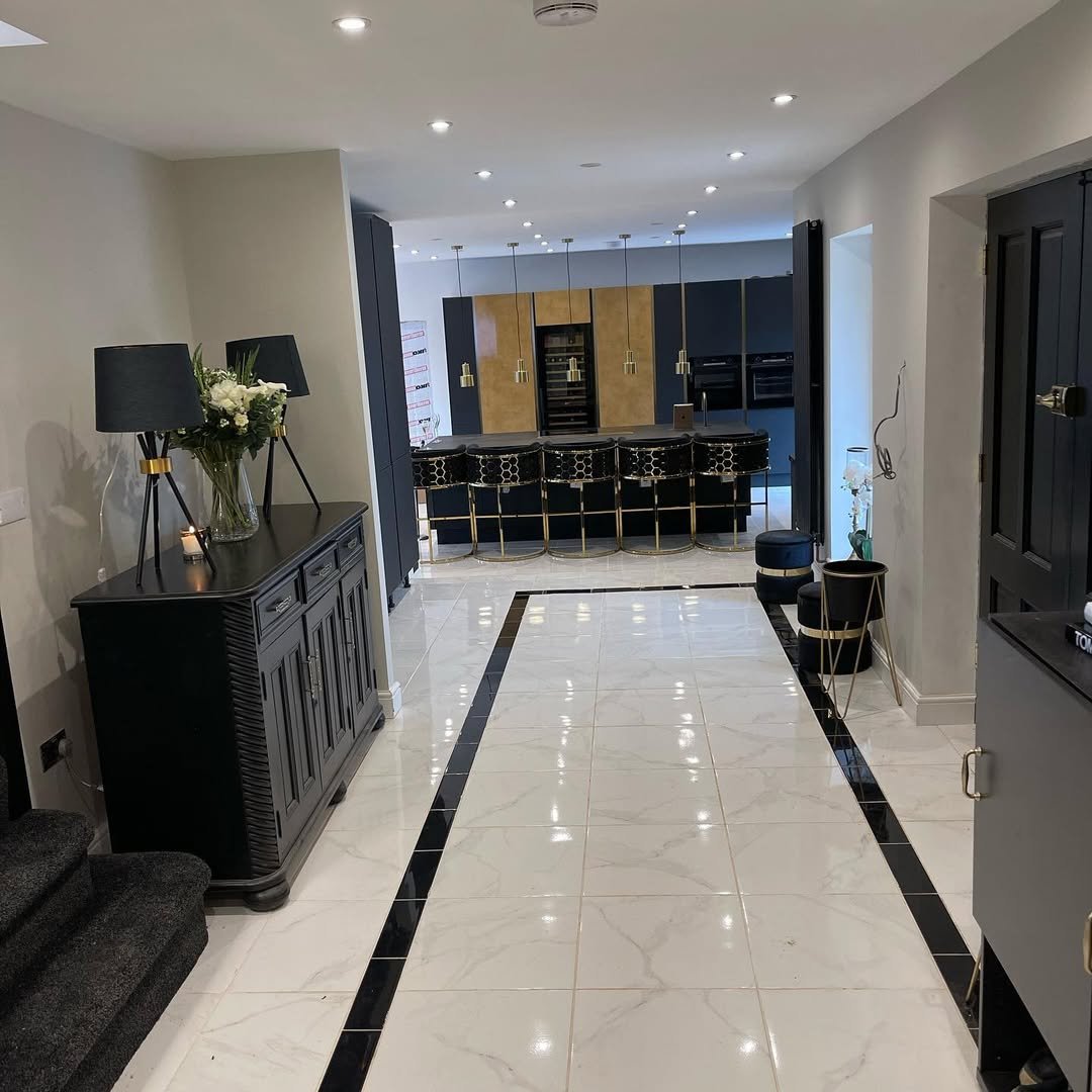 This hallway feels polished from the first step. Glossy floors, clean lines, and a glimpse into that bold kitchen beyond create a sense of flow and intention.
