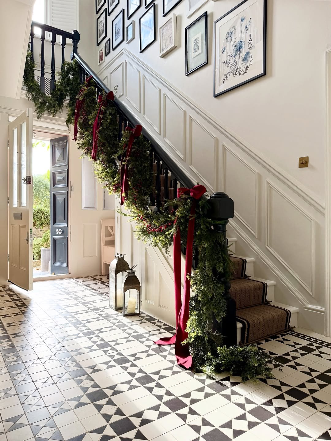 This entry feels like the opening scene of a holiday film. The patterned tile underfoot sets a classic tone, while that lush garland draped along the banister brings in movement, texture, and just the right hint of celebration.