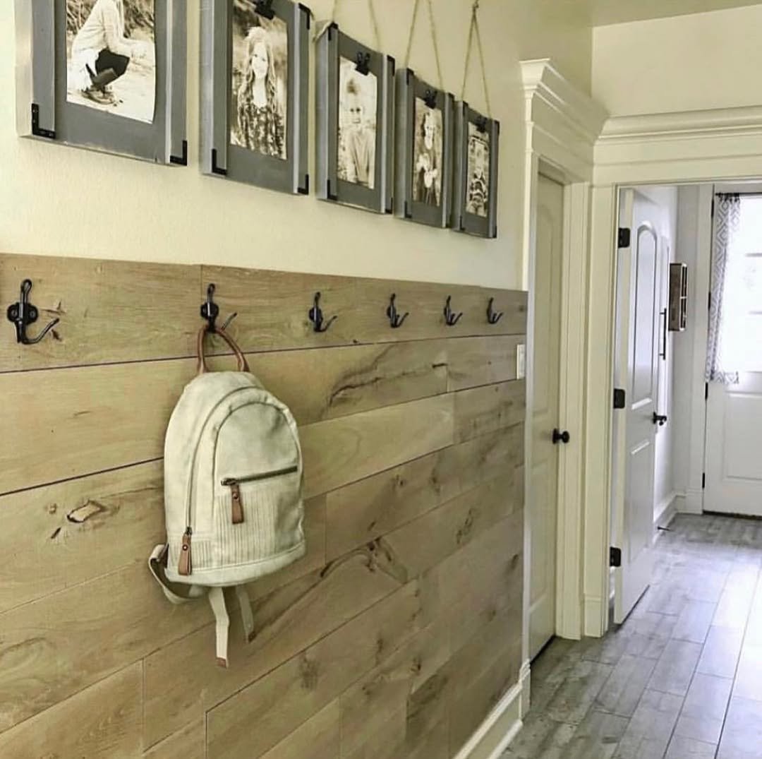This hallway works hard, but still looks good doing it. The wood paneling, hooks, and framed photos create a space that feels personal and practical at the same time.