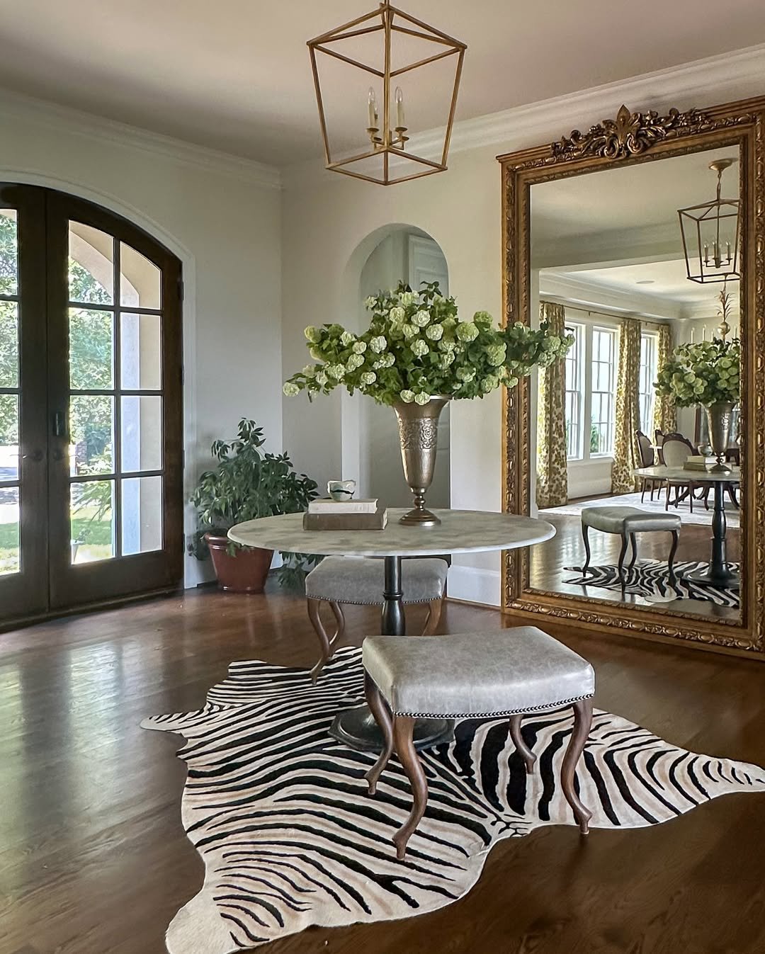 The zebra rug adds just enough contrast to keep things from feeling too formal. It’s polished, but there’s personality woven in, the kind that makes guests linger a little longer.