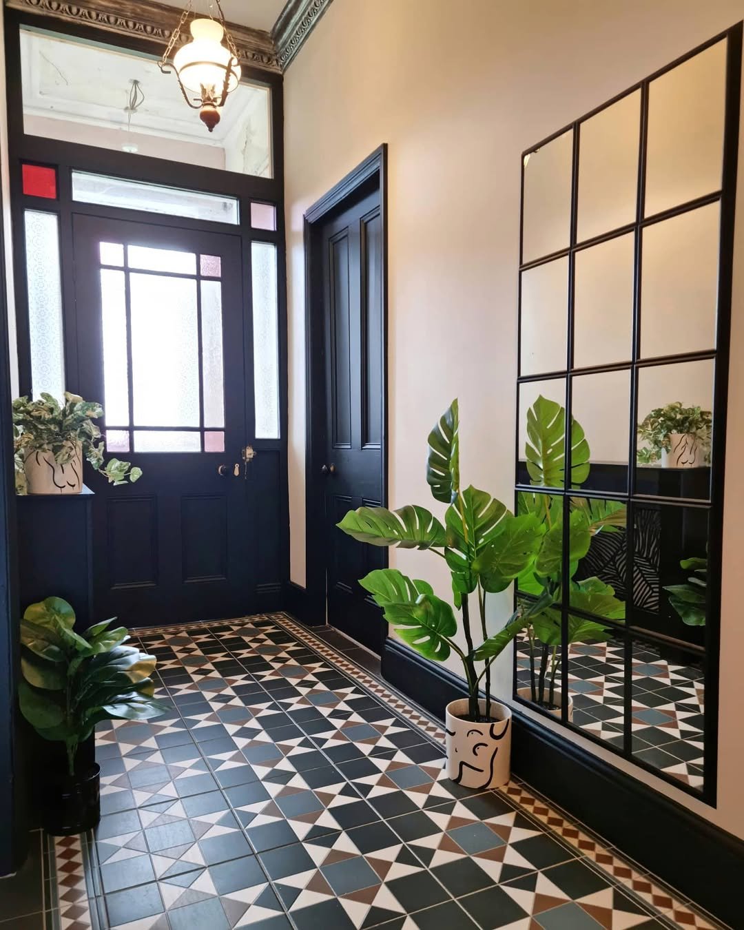 This entryway feels like stepping into a story that’s already been told beautifully. The patterned floor sets the tone right away, grounded by deep inky doors and that grid mirror reflecting light like a quiet statement piece.