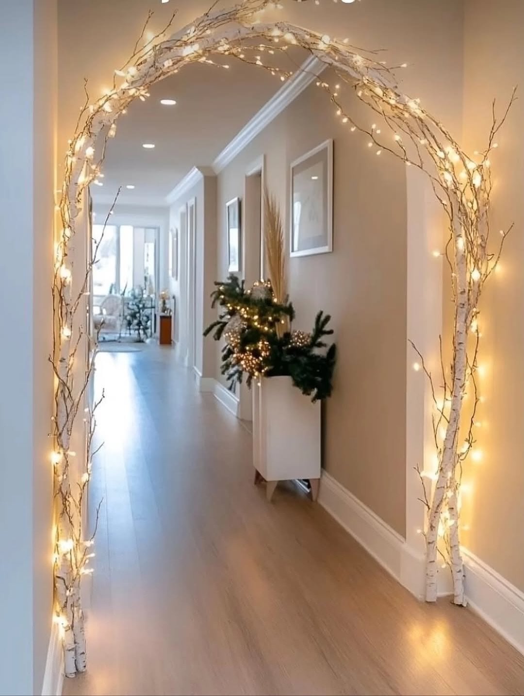 This hallway feels almost magical, like stepping through a soft glow. The birch arch wrapped in tiny lights creates a moment that feels seasonal, but could easily shift with the mood of the home.