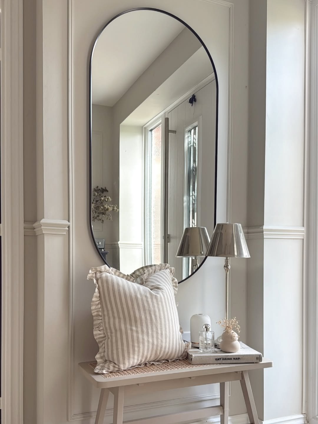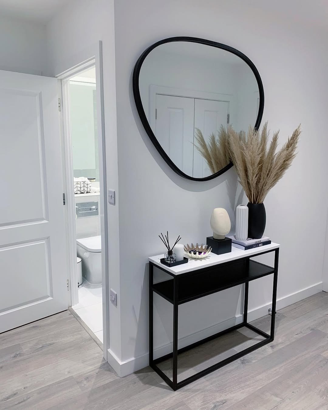 There’s something so calming about this setup. A slim black console, sculptural decor, and a softly curved mirror create a look that feels intentional without trying too hard.